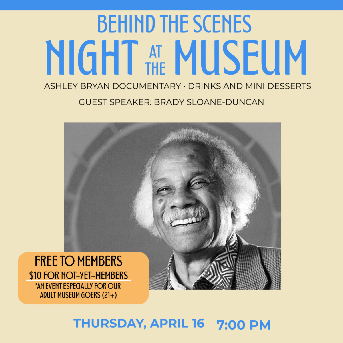 This is a night especially for our adult patrons! Join us for light desserts, drinks and an opportunity to hear from Brady Sloane-Duncan about her time curating the Ashley Bryan exhibit in 2009. This evening will also include a 30-minute documentary about the legendary Ashley Bryan.