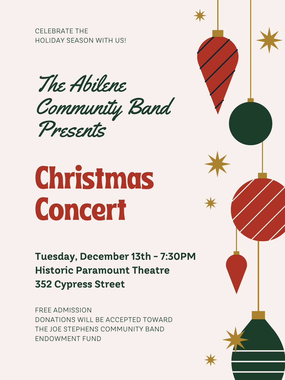 Christmas Concert Tuesday, December 13, 2022 7:30 PM 9:30 PM 19:30 21:30 Paramount Theatre 352 Cypress Street Abilene, TX, 79601 United States (map) Google Calendar ICS The Abilene Community Band presents our annual Christmas concert on Tuesday, December 13th, 2022 at the Paramount Theatre. Admission is free, and donations will be accepted toward the Joe Stephens Community Band Endowment Fund.