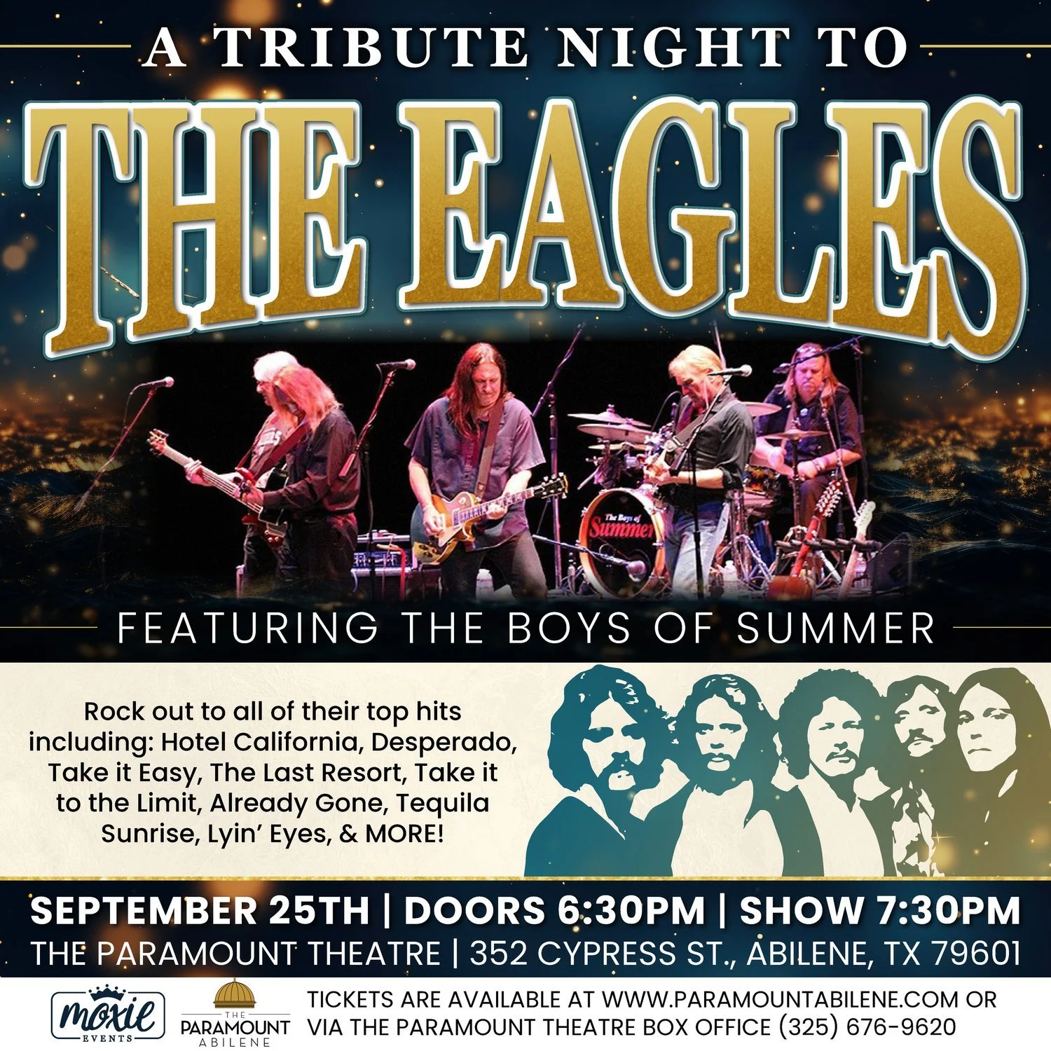The Boys of Summer Eagles Band hail right from Southern California. They grew up there and all have Eagles blood running through their veins. They re-create some of the greatest music ever written. With hundreds of high profile shows throughout the U.S. since 2004, BOS are becoming known as the top touring Eagles Tribute band in America.