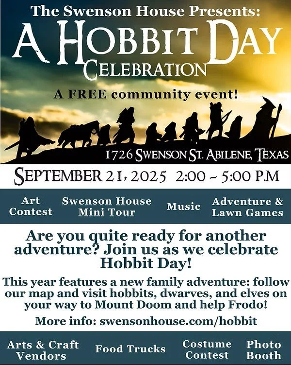September 21 2-5pm 2nd Annual Hobbit Day Celebration - Free Community Festival with Art Contest & Costume Contest. More info at swensonhouse.com/hobbit
