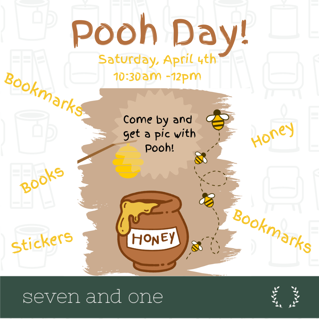 Pooh Day! Saturday, April 4, 2026 10:30 AM 11:30 AM 10:30 11:30 Seven and One Books 1138 N 2nd St Abilene, Texas 79601 United States (map) Google Calendar ICS Celebrate Pooh Day at the bookstore! Come take a picture with our favorite honey bear!Admission Free