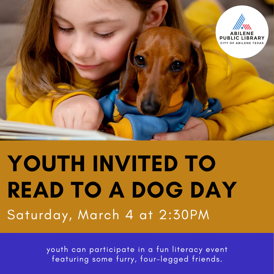Elementary-aged youth are invited to come out to the South Branch Library to participate in a fun literacy event with a Read to a Dog Day session. Although your library has hosted these in the past, this will be the first session conducted at this branch. Come on out (without your pets) and sign-up to read to one of our four-legged friends, thanks to Abilene Therapy Dogs. They’ll be the most patient and polite listeners as youth will be able to come in, select a book to read, and then practice their reading with a furry friend, who won’t judge you from fumbling your words as you read. Don’t miss out on this popular literacy event. Everyone who wants to read will get the chance to do so.