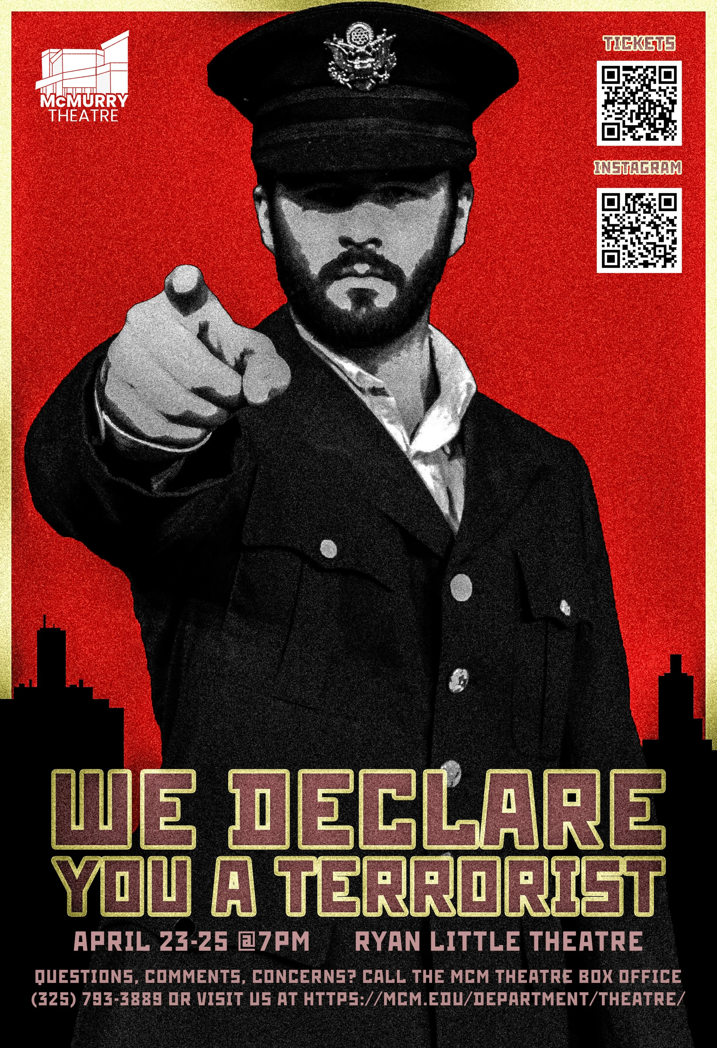 We Declare You A Terrorist Thursday, April 23, 2026 7:30 PM 19:30 Saturday, April 25, 2026 9:30 PM 21:30 McMurry University - Ryan Little Theatre 1642 Sayles Drive Abilene, TX, 79605 United States (map) Google Calendar ICS by Tim J LordPerformances for this student directed production of McMurry Department of Theatre will be April 23 thru 25.